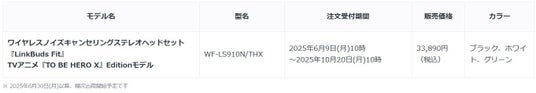 ソニーマーケティング株式会社は、密閉型のワイヤレスノイズキャンセリングステレオヘッドセット『LinkBuds Fit(リンクバッズ フィット)』と、TVアニメ『TO BE HERO X』がコラボレーションしたソニーストア限定オリジナルモデルの注文受付を本日6月9日(月)から開始します。