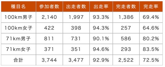 エントリー数は3,744名、当日出走者3,477名、うち完走者2,522名(完走率72.5%)。
