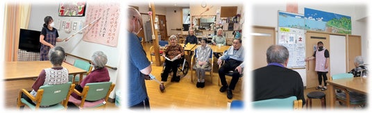 三重エリアの愛の家グループホームでは、日々のケアの中に口腔体操・発声・下肢の運動を組み合わせたオリジナルの健康プログラムを取り入れています。<例>