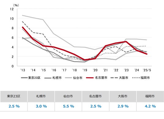 三幸エステート株式会社(本社:東京都中央区、取締役社長:武井重夫)は、2025年5月度の名古屋市オフィス賃貸状況(空室率&現空面積:全規模、募集賃料&募集面積:全規模、規模別空室率、主要エリア※1空室率:全規模)および全国6大都市(東京・札幌・仙台・名古屋・大阪・福岡)の大規模ビルのマーケットデータをまとめた「オフィスマーケット2025年6月号名古屋」を公表します。