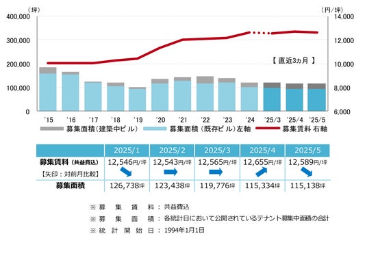 募集賃料は前月比マイナス66円/坪の12,589円/坪となった。3ヵ月ぶりで下落したものの、12,000円/坪台半ばでの小幅な動きが続いている。