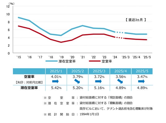 空室率は前月比マイナス0.09ポイントの3.47%となり、8ヵ月連続の低下となった。主要エリアの築浅大規模ビルを中心に、市内でのビルグレード改善や拡張移転等により空室消化が進んだ。潜在空室率は前月から横ばいの4.89%だった。