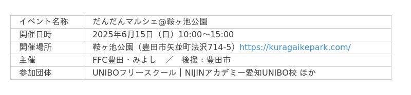愛知県豊田市の鞍ヶ池公園にて開催される「だんだんマルシェ」に、UNIBOフリースクール|NIJINアカデミー愛知UNIBO校の子どもたちが“子どもスタッフ”として初参加します。