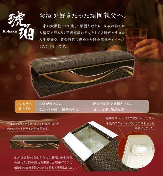 伝統的紋様「菊つなぎ」が入ったスタイリッシュなお棺 ~琥珀~