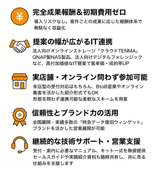 貴社の強みと地域性を活かしながら、データ復旧という“緊急かつ重要なニーズ”に応えるパートナーシップを築きませんか?
