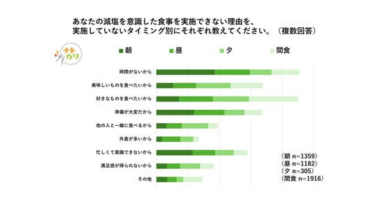●減塩が実践できない理由は、朝食や昼食時では「時間がない」、夕食時では「好きなものを食べたい」と感じ、“やりたいけどやれない場面がある”というリアルな声が浮き彫りに。
