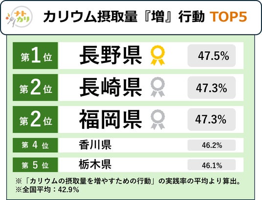 合わせて、「ナトカリ行動」(ナトリウムを減らす行動及びカリウムを増やす行動)の各項目のスコア平均を47都道府県で比較したところ、「ナトリウムの摂取量を減らすための行動」の場合1位は「北海道」、「カリウムを増やすための行動」の1位は「長野県」、という結果となりました。さらに、総合結果として、最も「ナトカリ行動」を実践できている県民の割合が多いのは「長崎県」であり、「ナトカリ」を意識していることで、しっかり行動もできていることが分かりました。