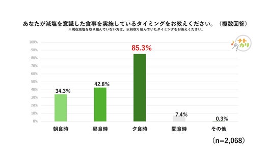 減塩の取組経験のある方2,068人に減塩を意識した食事を実施している(していた)タイミングを尋ねたところ、 「夕食時」が最も多く、朝・昼・夕の3食の中では、朝食時が最も少ない結果になりました。
