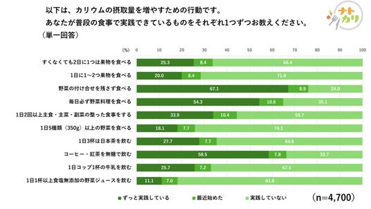 そこで、当社は減塩を続けながらも生活者に意識していただきたいこととして、ナトリウムの排せつを促すカリウムを野菜や果実などから積極的に摂取する「ナトカリ」という考え方の普及に取り組んでいます。その一環として、減塩の継続の難しさを感じている生活者の実態と、それをサポートする一つの手段となる「ナトカリ」の認知度を明らかにするために、自身の血圧に関心のある20~69歳男女4,700名を対象に、「全国一斉ナトカリ意識調査」を実施しました。