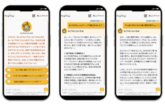 本連携・本キャンペーンの特設サイトでは、“なごや圏”を旅の目的地に選びたくなるきっかけとして、会話型AIコンシェルジュ「なごやえこひいきAI」を提供します。たとえば「大阪・関西万博に行く予定」と入力すると、「その前に愛知で予習しませんか?2005年に愛・地球博やってましたから」と返してくるなど、どんな内容にも“なごや”を全力でおすすめしてくる偏愛仕様のAIです。あまりの推しぶりにツッコミを入れたくなる一方で、“なごや圏”の意外な魅力を知り、雑談のきっかけとしても楽しめます。