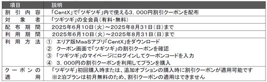 名鉄が展開するエリア版MaaSアプリ「CentX」を通じて、東急の定額制宿泊サービス「ツギツギ」を初めて利用する方が気軽に始められるよう、3,000円分の割引クーポンを提供します。“なごや圏”に限らず、全国の提携ホテルで利用可能な「ツギツギ」をまずは体験してもらうことを目的にした特別な割引です。