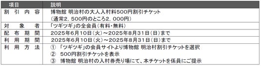 名鉄グループが運営する博物館 明治村を、東急の定額制宿泊サービス「ツギツギ」の会員限定で、もっと気軽に訪れていただけるよう、大人500円分の入村料割引チケットを提供します。“なごや圏”の宿泊にあわせて、明治の街並みや文化に触れ、ちょっとだけ時代をさかのぼる体験を楽しんでもらうことを目的にした特別な割引です。