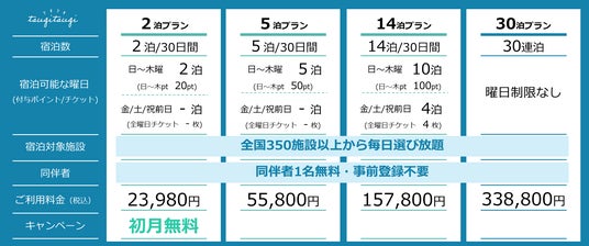 2泊・5泊・14泊・30泊の計4プランを販売しています。また、「2泊プラン初月無料キャンペーン」を実施中です。「ツギツギ」は全プランで同伴者1名まで無料でご利用いただくことができ、利用除外日はございません。各プランの詳細はサービスサイトよりご確認ください。(https://tsugitsugi.com/)