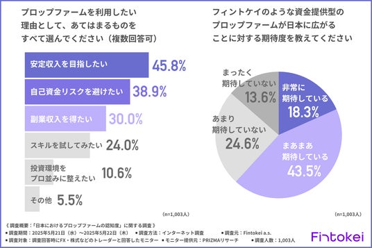 「フィントケイのような資金提供型のプロップファームが日本に広がることに対する期待度」について尋ねたところ、約6割が『非常に期待している(18.3%)』『まあまあ期待している(43.5%)』と回答しました。