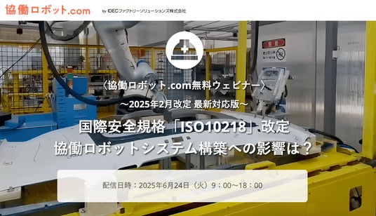 協働ロボット.com を運営するロボットSIer(システムインテグレータ)、IDEC ファクトリーソリューションズ株式会社(愛知県一宮市、代表取締役社長:藤木 勝敏)は、2025年6月24日火曜日に無料ウェビナー(オンラインセミナー)を実施します。今回のウェビナーテーマは国際安全規格「ISO10218」改定です。2025年2月、14年ぶりに発表された「ISO10218」改定が今後、協働ロボットシステム構築にどのような影響を与えるのか、まさに協働ロボットシステムの安全に関わる方にとって、必見の内容と自負する次第です。