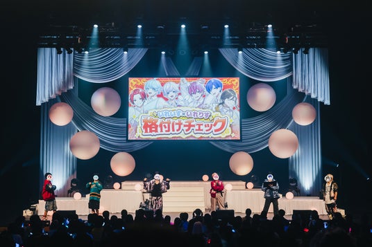 第2部のメイン企画として実施されたのが、某人気テレビ番組をオマージュしたチーム対抗のパロディゲーム「いれいす×いれりす 格付けチェック」。普段のライブや配信とは一線を画す内容に、ファンの期待も高まります。普段は、リーダーのないこが司会進行を務めておりますが、この日の司会進行はイベント特別仕様としてIfが担当。軽快なトークと進行でイベントを盛り上げました。りうら、ないこ、悠佑の「チームイレギュラー」と-hotoke-、初兎、Ifの「チームダイス」 の2チームに分かれて対戦。観客席もチームごとに分かれ、参加型の演出が行われました。両チームとも「ご本人様」という最高ランクからスタートし、出題される“いれいすにまつわる2択問題”に回答。不正解の場合は「ガチ勢」「中級者」「見習い」とランクが下がっていく仕組みで、座る椅子のランクもそれに応じて変化していきます。
