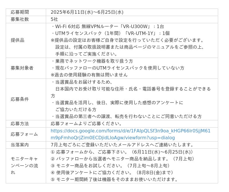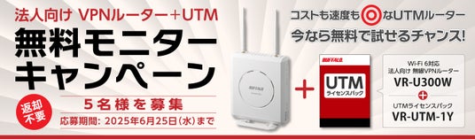 株式会社バッファロー(本社:東京都千代田区、代表取締役 社長執行役員CEO:牧 寛之)は、2025年6月11日(水)から6月25日(水)まで、5社様にWi-Fi 6対応 法人向け無線VPNルーター「VR-U300W」と1年間のUTMライセンスパック 「VR-UTM-1Y」を無料で提供するモニターキャンペーンを開催いたします。