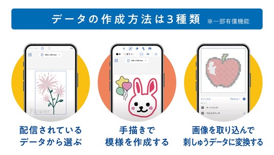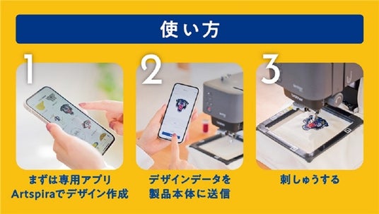 ・・・製品本体には操作パネルがなく、刺しゅうデータは専用アプリ「Artspira」をインストールしたスマートフォンやタブレットから転送する。専用アプリ「Artspira」は、豊富な模様が搭載されているほか、オリジナルのデザインを作成したり、模様を編集したりできる。