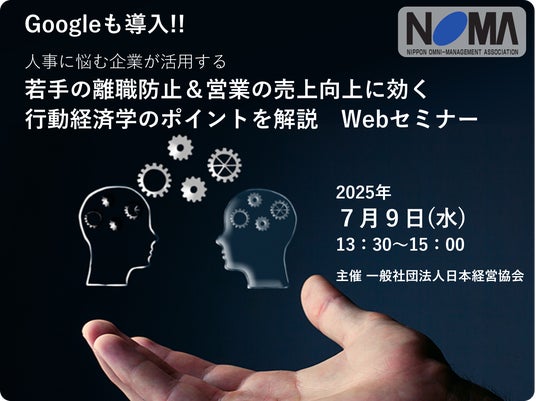 一般社団法人日本経営協会(本部事務局:東京都渋谷区、会長:高原 豪久)は、若手社員の定着率向上を目的とした無料オンラインセミナー「【Googleも導入】人事に悩む企業が活用する『若手の離職防止&営業の売上向上』に効く行動経済学」を、2025年7月9日(水)13:30~15:00に開催いたします。