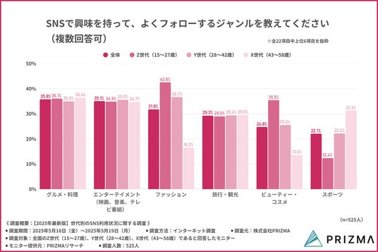 フォローされているジャンルは、Z世代では『ファッション』『ビューティー・コスメ』など“自己表現”や“トレンド重視”の傾向が強く、一方X世代では『グルメ・料理』『旅行』『スポーツ』といった“生活密着型”の関心が目立ちました。