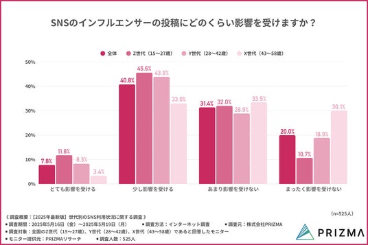 一方、X世代では『まったく影響を受けない(30.1%)』が最多で、情報源としての信頼や関心が分かれる結果となりました。