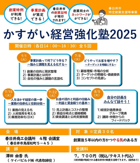 当所では、創業後5年以内の起業家や創業を目指す方を対象に、「かすがい経営強化塾2025」を開催いたします。本事業は、国の「特定創業支援等事業」に位置づけられており、受講者には春日井市から創業支援証明書が発行されるほか、創業特例制度の活用も可能です。