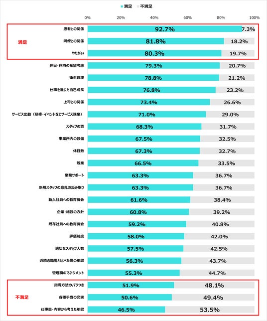 不満足な点は「仕事量・内容から考えた年収(53.5%)」、「各種手当の充実(49.4%)」、「指導方法のバラつき(48.1%)」が上位となった。