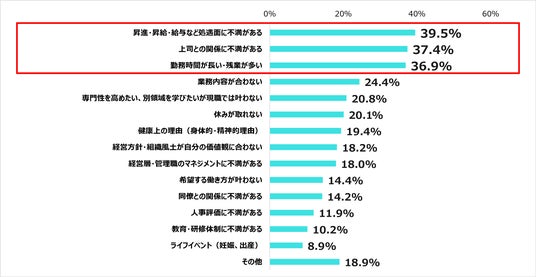 次いで「上司との関係に不満がある(37.4%)」、「勤務時間が長い・残業が多い(36.9%)」が上位となった。