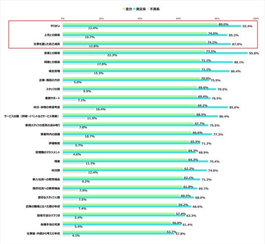 3.職場に満足している治療家と不満を抱える治療家の満足度に対する差分の上位は「やりがい(80.0%)」、「上司との関係(74.6%)」、「仕事を通じた自己成長(74.2%)」