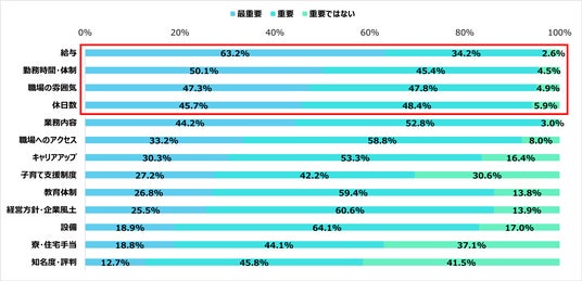 次いで「勤務時間・体制(50.1%)」、「職場の雰囲気(47.3%)」、「休日数(45.7%)」が上位となった。「業務内容(44.2%)」、「職場へのアクセス(33.2%)」も優先度が高い。