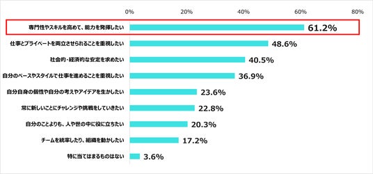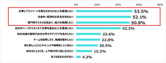 次いで「社会的・経済的な安定を求めたい(52.1%)」、「専門性やスキルを高めて、能力を発揮したい(50.8%)」も僅差となった。