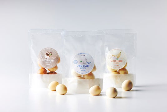 ウズハビ スイーツ従来は廃棄されていたB級品のうずら卵に新たな命と価値を吹き込んだ商品です。国産うずら卵をそのまま使った、ギルトフリーでタンパク質(1袋あたり5g入り)摂取できる新感覚スイーツ。