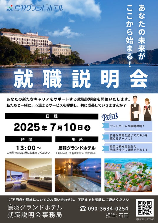 このたび、鳥羽グランドホテルでは、旅館ホテルで、自ら「学び」や「向上」を目指す人材を募集するため、現地での就職説明会を実施します。