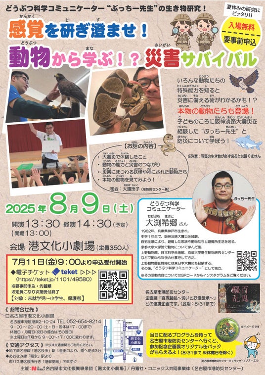 2025年8月9日(土) どうぶつ科学コミュニケーター”ぶっちー先生”の生き物研究!「感覚を研ぎ澄ませ!動物から学ぶ!?災害サバイバル」を名古屋市港文化小劇場で開催。