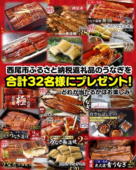 本キャンペーンでは、西尾市のふるさと納税返礼品提供事業者16者のご協力のもと、抽選で合計32名様に西尾市自慢のうなぎをプレゼント。