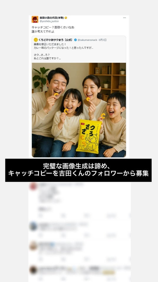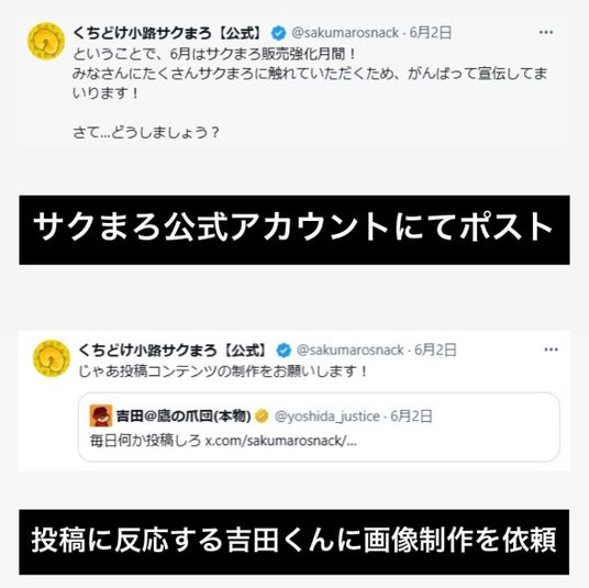 X(旧Twitter)のサクまろアカウント( @sakumarosnack )と26万フォロワーを擁する鷹の爪団・吉田くんのアカウント( @yoshida_justice )からフォロワーに呼びかけ、サクまろを楽しむシチュエーションやキャッチコピーなどのアイデアを募集。そのアイデアを活かした画像や動画を即座に生成・投稿します。