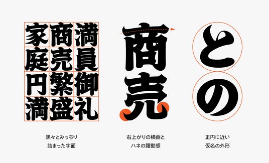 金シャチフォントは、名古屋文化の象徴を反映したフォントで、都市フォントプロジェクト誕生のきっかけとなったものです。2020年3月に華やかでゴージャス感のある「金シャチフォント 姫」をリリースしています。今回発表する「金シャチフォント 殿」は、堂々たる殿様ぶりを感じさせる筆書系の書体で、太い筆に墨をたっぷり含ませたようなストロークに律動的なうねりと反りをもたせ、伝統的な様式美を活字書体にしています。歌舞伎文字、相撲文字、寄席文字などの江戸文字の特徴を取り入れつつ、特定の芸能分野に縛られない現代の江戸文字を目指しています。