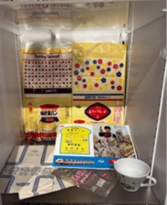 フジパンコーナー 昭和時代に発売していたパンの包装紙や販売店向けのチラシなども展示していただいています。