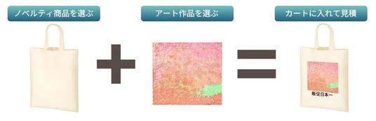 1.フルカラー印刷に対応しているノベルティ商品を選んでいただき、お見積りカートへ入れます。2.お好きなアートを選び、同じくお見積カートへ入れます。