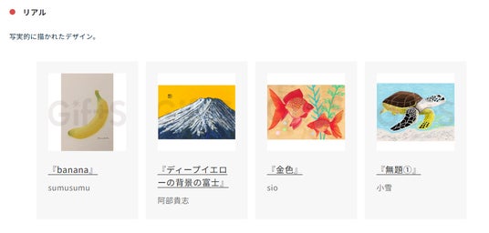 これまでも、「アート作品をノベルティに印刷できるサービス」が存在していなかったわけではありません。しかしそれらのサービスでは、1点~数点の非常に限られたアート作品しか選べませんでした。しかし私たちの提供するGiftS(ギフツ)では、100点ものアート作品を取り扱うことが可能。ポップ、キュート、クール、リアル、パターン、メッセージという6つのカテゴリーからお好みのアート作品を探して、企業イメージにピッタリの「SDGsノベルティ」を作り出すことができます。