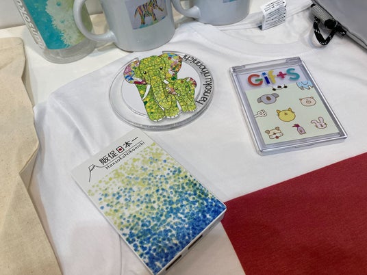 さまざまなアイテムにアートを印刷したサンプルを展示。