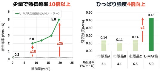 左:Thermalniteの添加量における複合樹脂の熱伝導率、右:市販品との引張強度比較