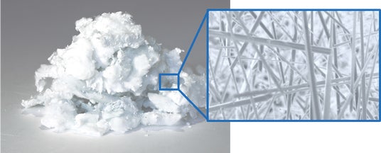 左:Thermalnite(ファイバー状窒化アルミニウム単結晶)写真、右:Thermalnite SEM像