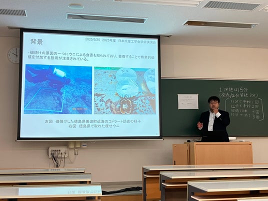 本研究成果は、2025年5月25日に日本水産工学会の学術大会(場所:国立研究開発法人水産研究・教育機構 水産大学校)にて演題「ムラサキウニ養殖でのウルトラファインバブル効果の解析」として発表されました。