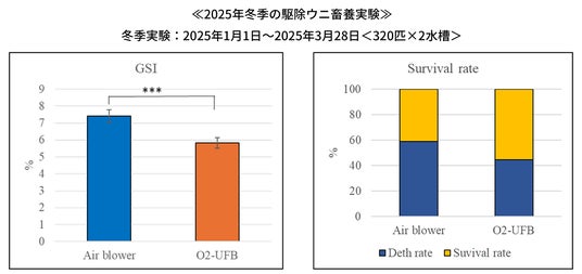 左:ウニの実入り(GSI)冬季はO2-UFB水槽は増大しない/右:冬季でもO2-UFB水槽は生残率が高い