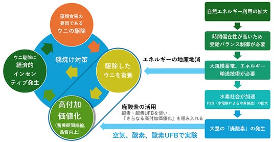 この2つの背景から、エネルギーとして注目されている水素の製造時に排出される「酸素」と「UFB生成技術」を組み合わせることにより、水素社会におけるエネルギーの地産地消と、磯焼け対策の駆除ウニの活用を両立することを目的に研究を行っています。