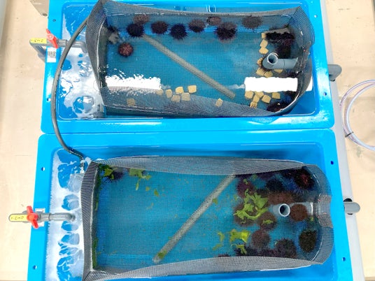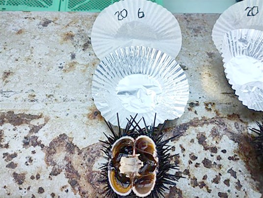 一方、世界中で沿岸漁場から海藻類が無くなる「磯焼け」という環境被害が深刻化しています。原因のひとつに、ウニやブダイなどによる食害(生物が過剰に海藻などを食べることで起こる被害)が知られています。磯焼け地帯のムラサキウニは、実入りが少なく「やせウニ」とも呼ばれます。人間が食べられる部分が少ない為、商業的価値が低く漁獲対象になりにくい存在です。磯焼けの課題解決の手段として、やせウニを蓄養することで商品価値をあたえる技術が注目されています。