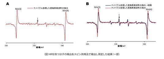 この度、UFBを人工的に発生させた水槽(徳島県美波町の海水を利用)において、UFBの重要な化学的性質であるヒドロキシルラジカル(活性酸素の一種:以下、HR)の発生を確認したことをお知らせいたします。この結果は、今後の養殖や水生生物に対してUFBが“実際に「与えられている」”という裏付けになる可能性があります。