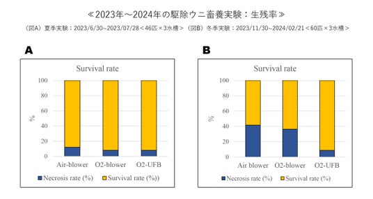 グラフ下部の“青色”は死亡率、上部の“黄色”は生残率。O2-UFBは冬季の生残率が高い