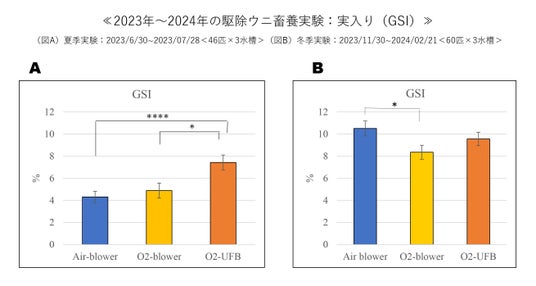 先回の研究で明らかになった通り、酸素を送りこむ酸素ブロア区よりも「O2-UFB」水槽の方が溶存酸素量(DO)は少ない状態になります。このことから、生残率を高めるのは酸素ではなく「UFB独自の作用」だと考えられます。一方で、ウニの実入り(GSI)については、空気ブロア区が1.4%高い値を示しており、「O2-UFB」水槽では冬季において大きな増加は確認されませんでした。